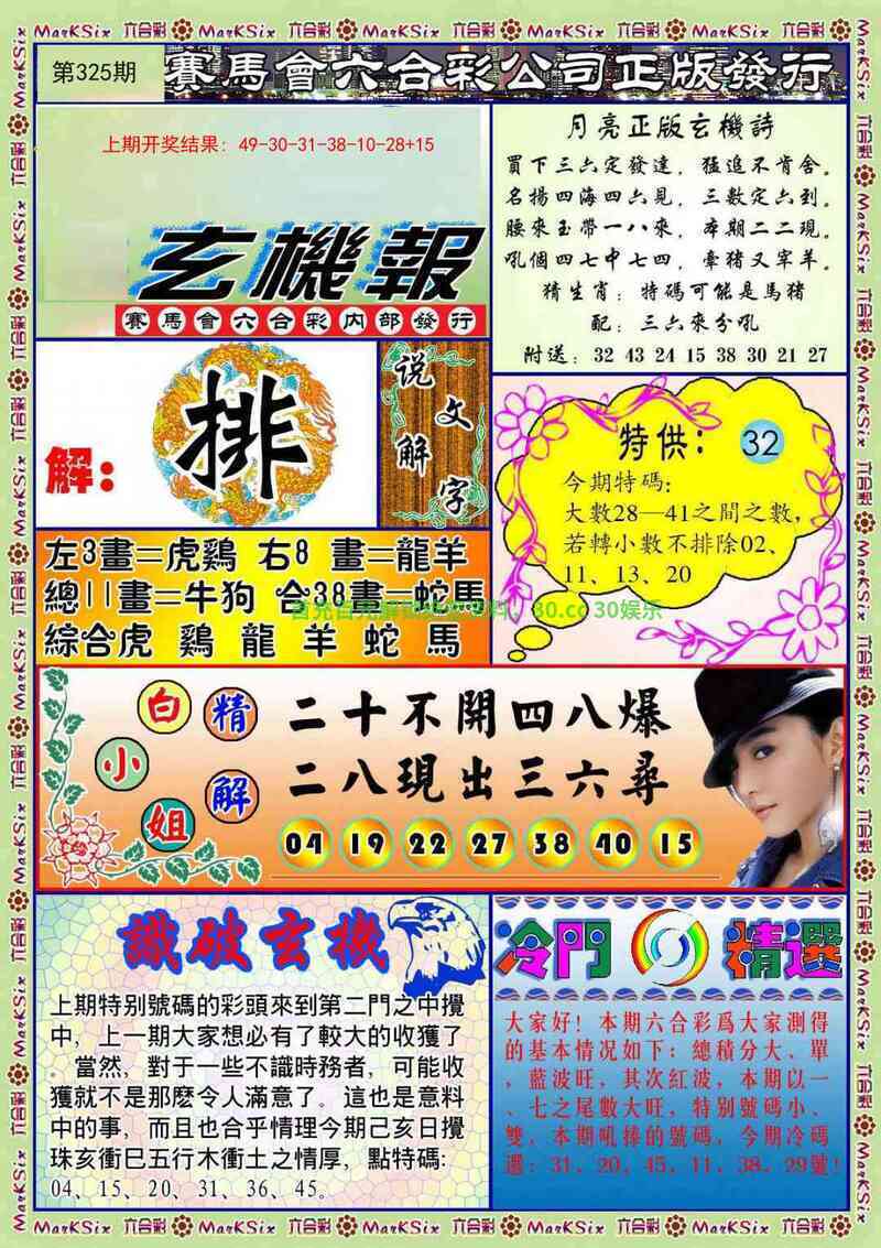 | 325期:七肖 | 牛鼠蛇鸡虎马猴 | 开:虎04准 |